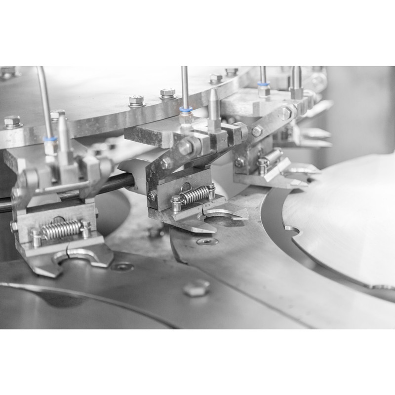 XGF14-12-5三合一灌裝機主要用于礦泉水、純凈水的灌裝作業。本機將沖洗、灌裝、旋蓋三功能合在一個機體上,全過程實現自動化。適用于聚酯瓶、塑料瓶,各部分的適用瓶型調整采用手柄轉動實現,輕松自如,簡便快捷。灌裝方式采用了新型的常壓灌裝,使灌裝速度更快更穩定,所以與同規格的機器相比本機的產 量更高,效益更大。本機采用了先進的可編程控制器(PLC)控制機器的自動運行,進瓶鏈道采用變頻器調整,與主機變頻器相互配合使進瓶運行更穩定可靠,光電檢測各部件的運行狀況。自動化程度高,操作簡便。是礦泉水、純凈水生產廠家理想的首先設備。